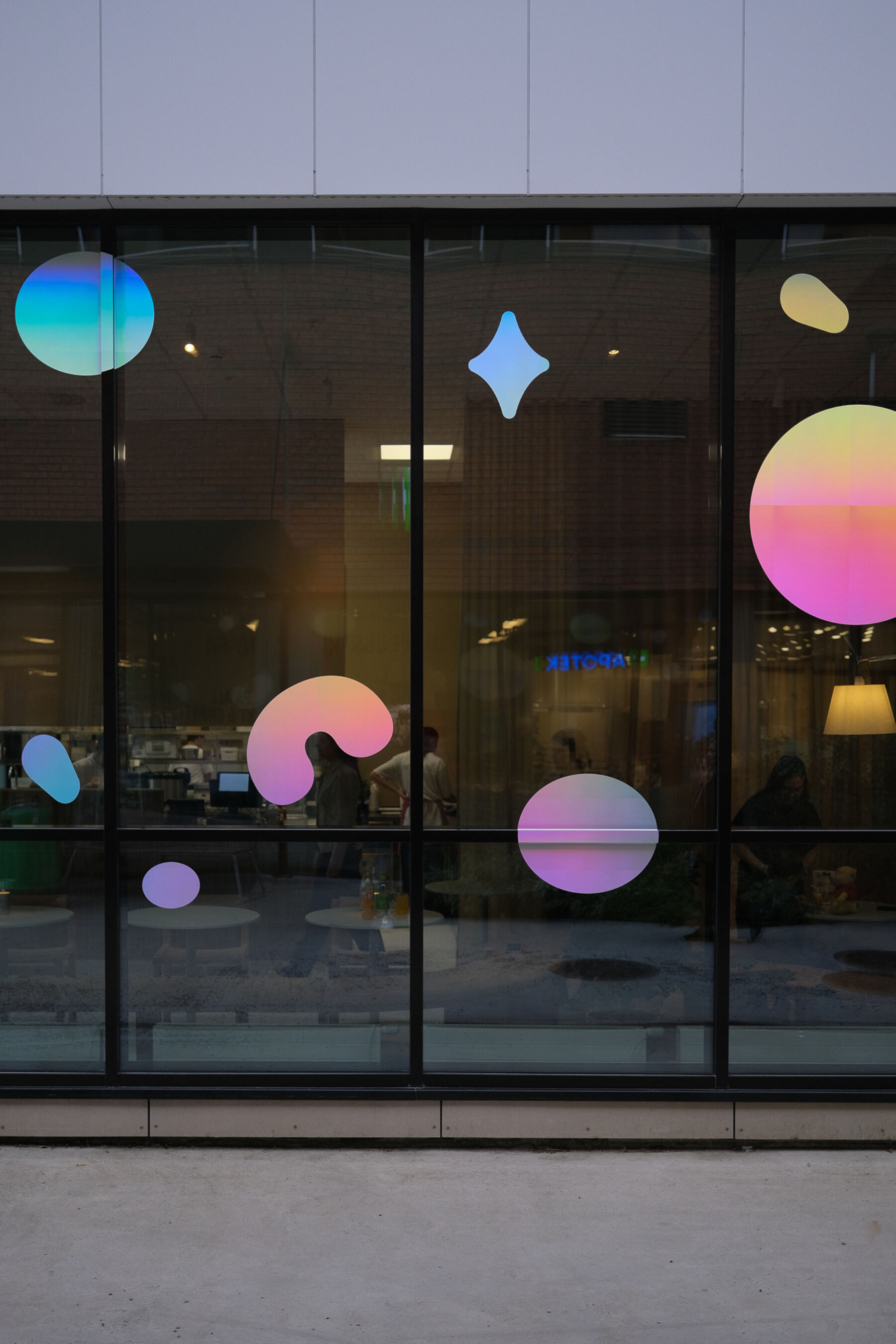 Vi utvikler også alle grafiske elementer til restauranten, som klistermerker til take away poser og esker, hvor den holografiske effekten går igjen. Vi har designet visittkort og menyer, samt uniformene til de ansatte som en del av den grafiske profilen.