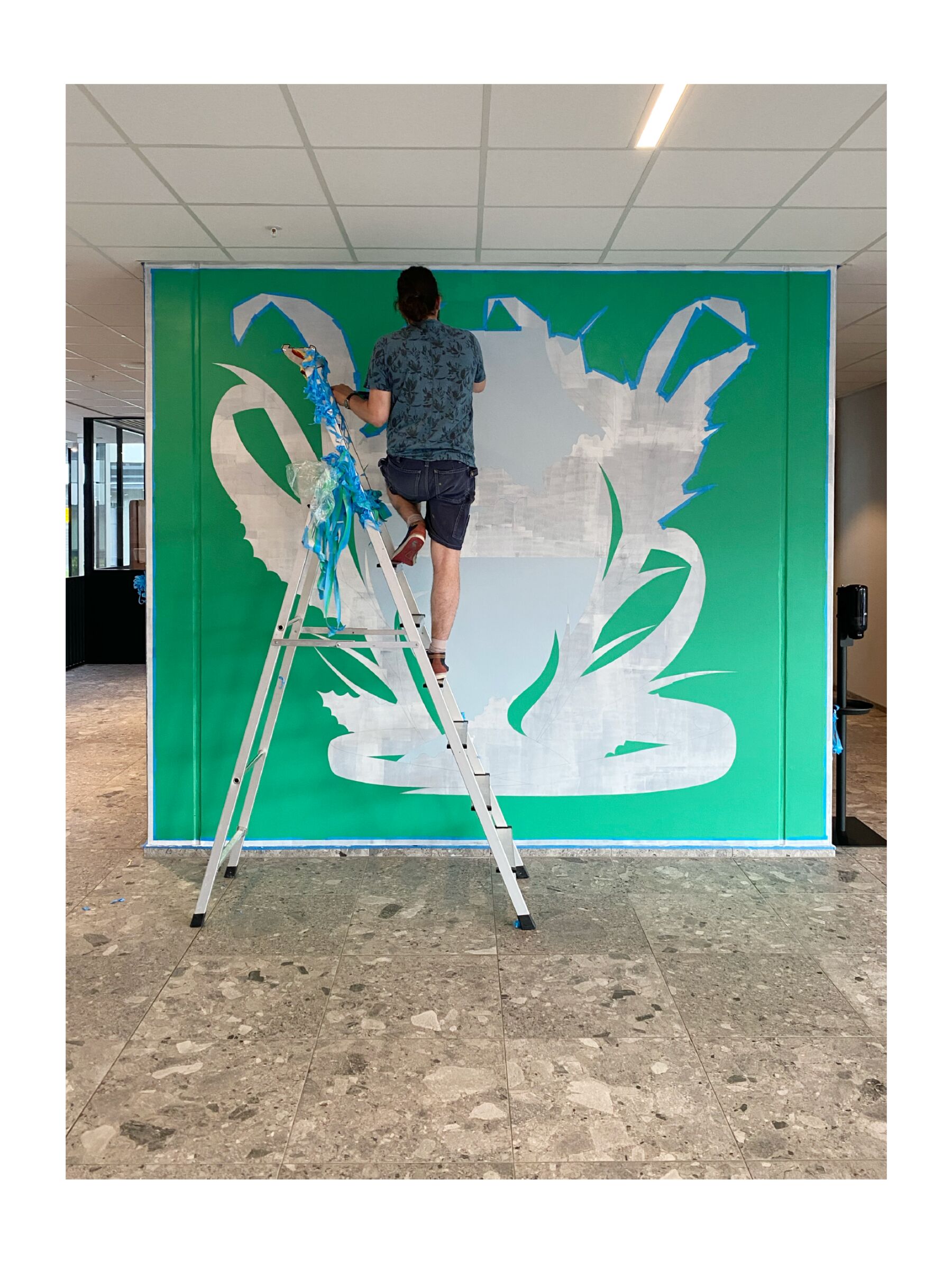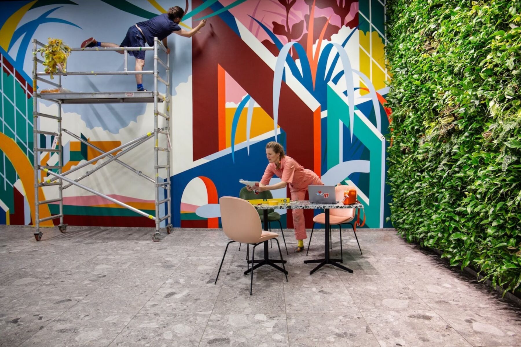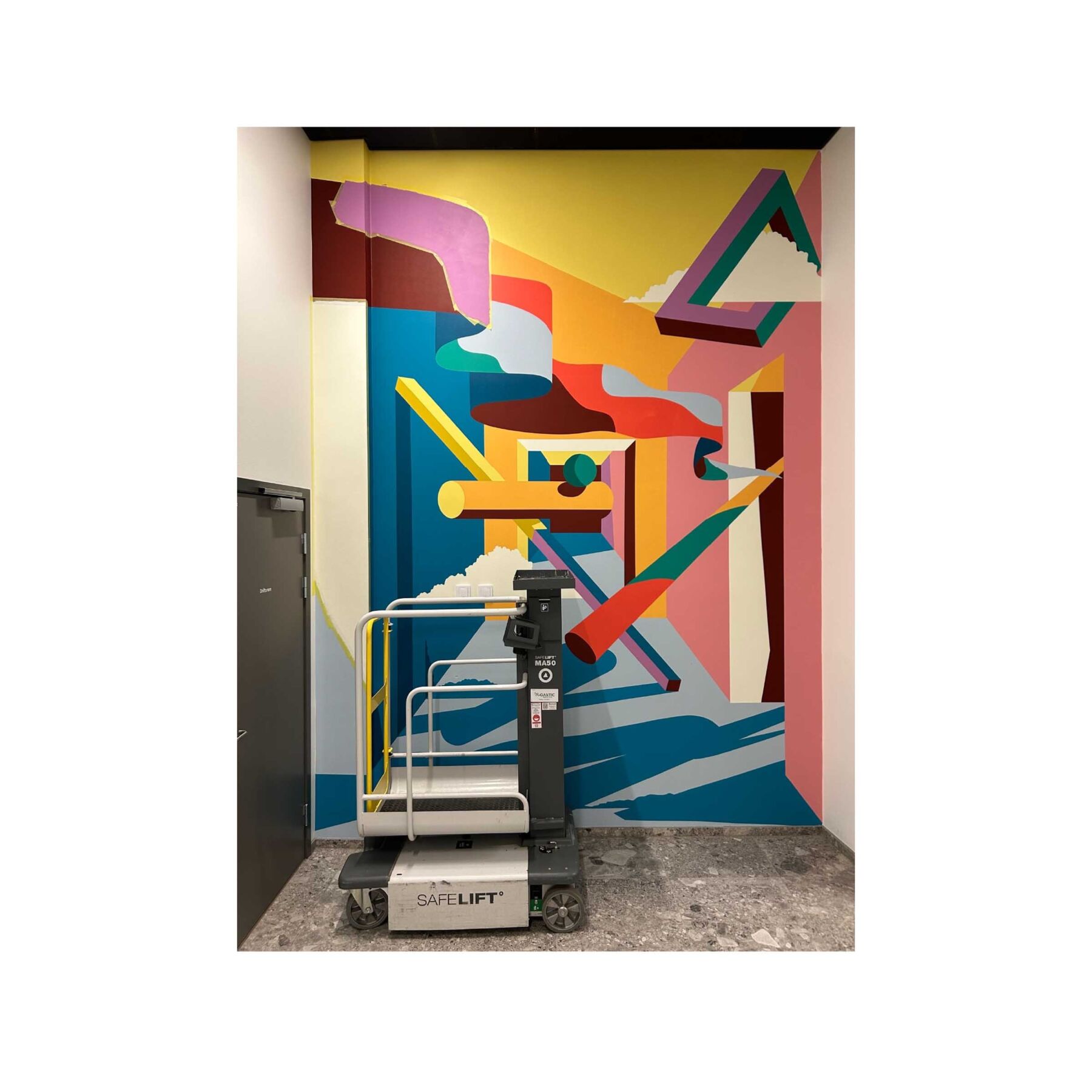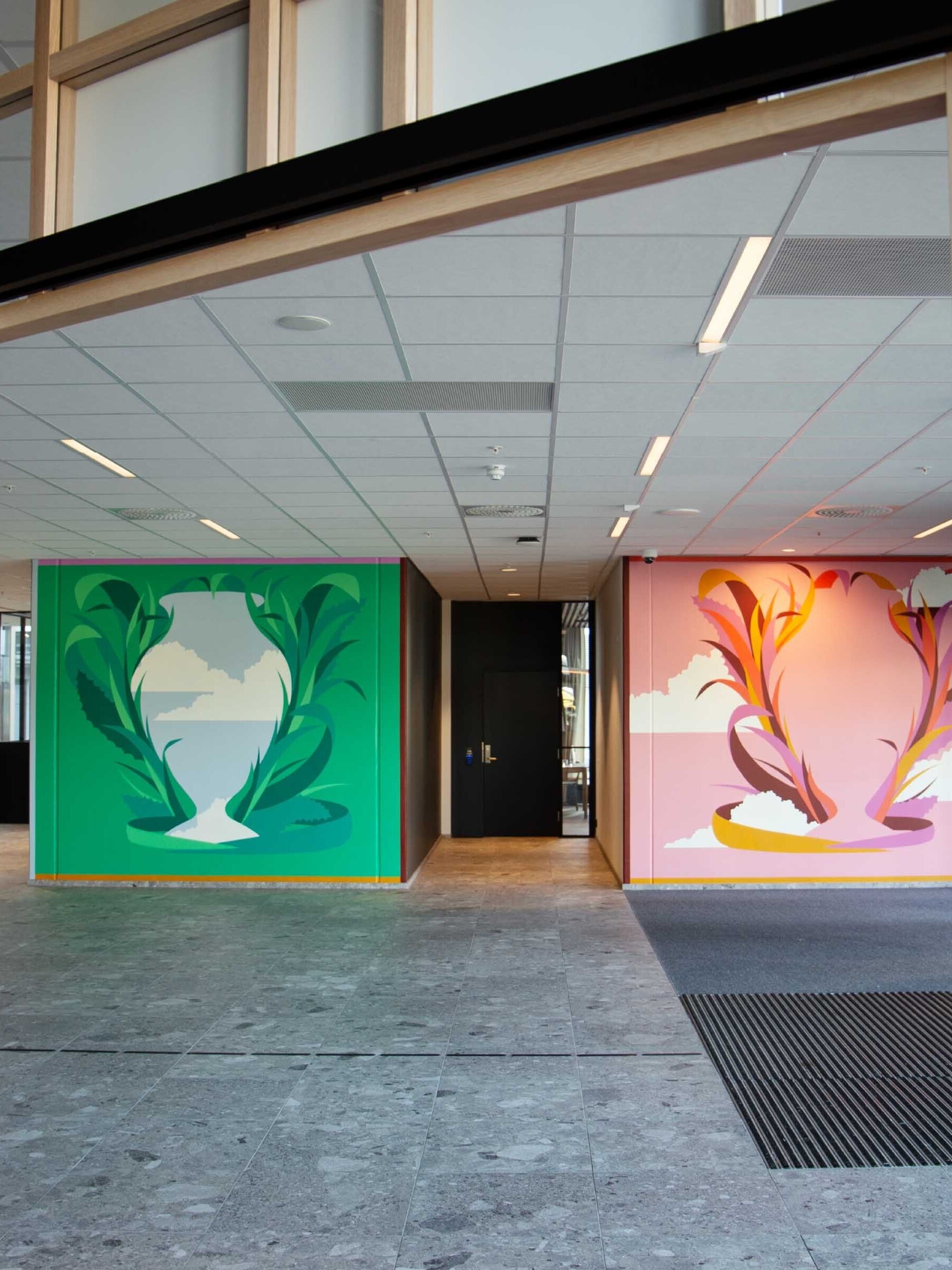 Gilles & Cecilie Studio har skapt fargerike veggmalerier på Økern Portal for å gi fellesområdene en unik identitet. Inspirert av arkitektur, natur og lysrefleksjoner, har de komponert malte kollasjer som guider besøkende gjennom bygget. Kunstverket forener fantasi og virkelighet, og inkluderer også typografiske elementer for å forbedre skiltingen.