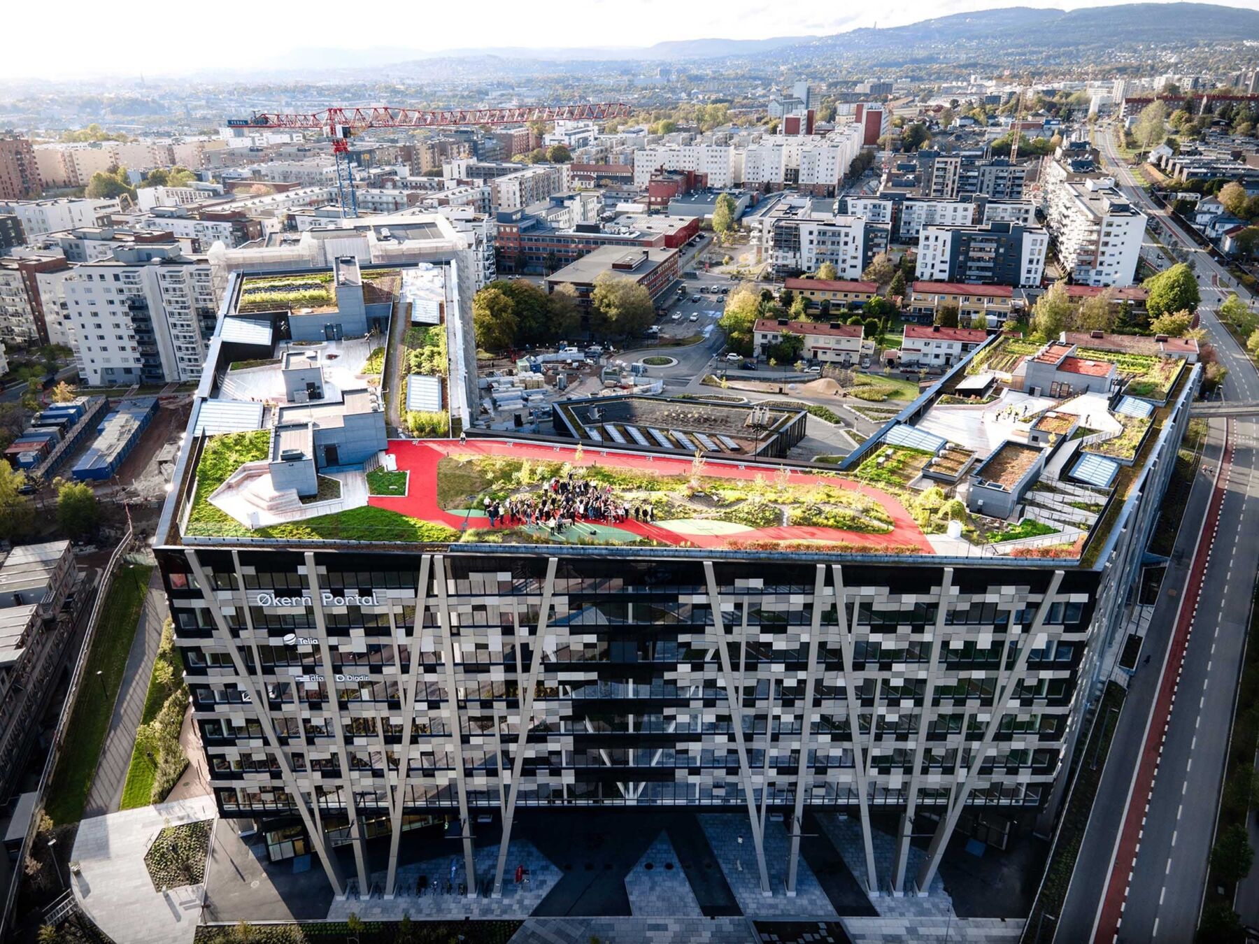 Dette området er stort! Med 55 000 kvadratmeter kontorlokaler, takhage, løpebane, lekeområder for barn, restauranter, kafeer og butikklokaler var det behov for vi å skape et ryddig uttrykk der man lett kunne orientere seg.