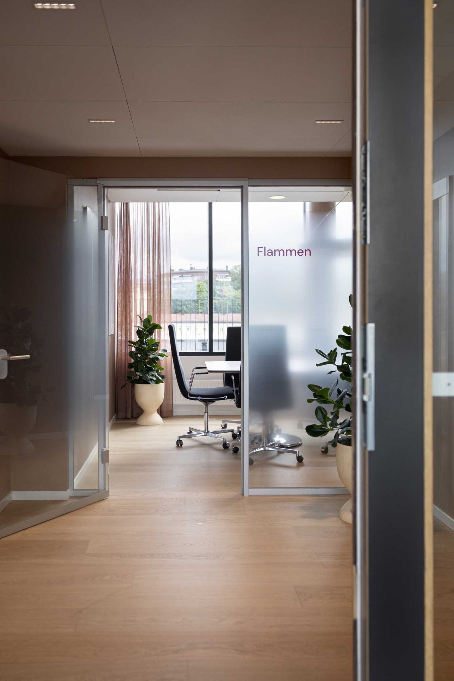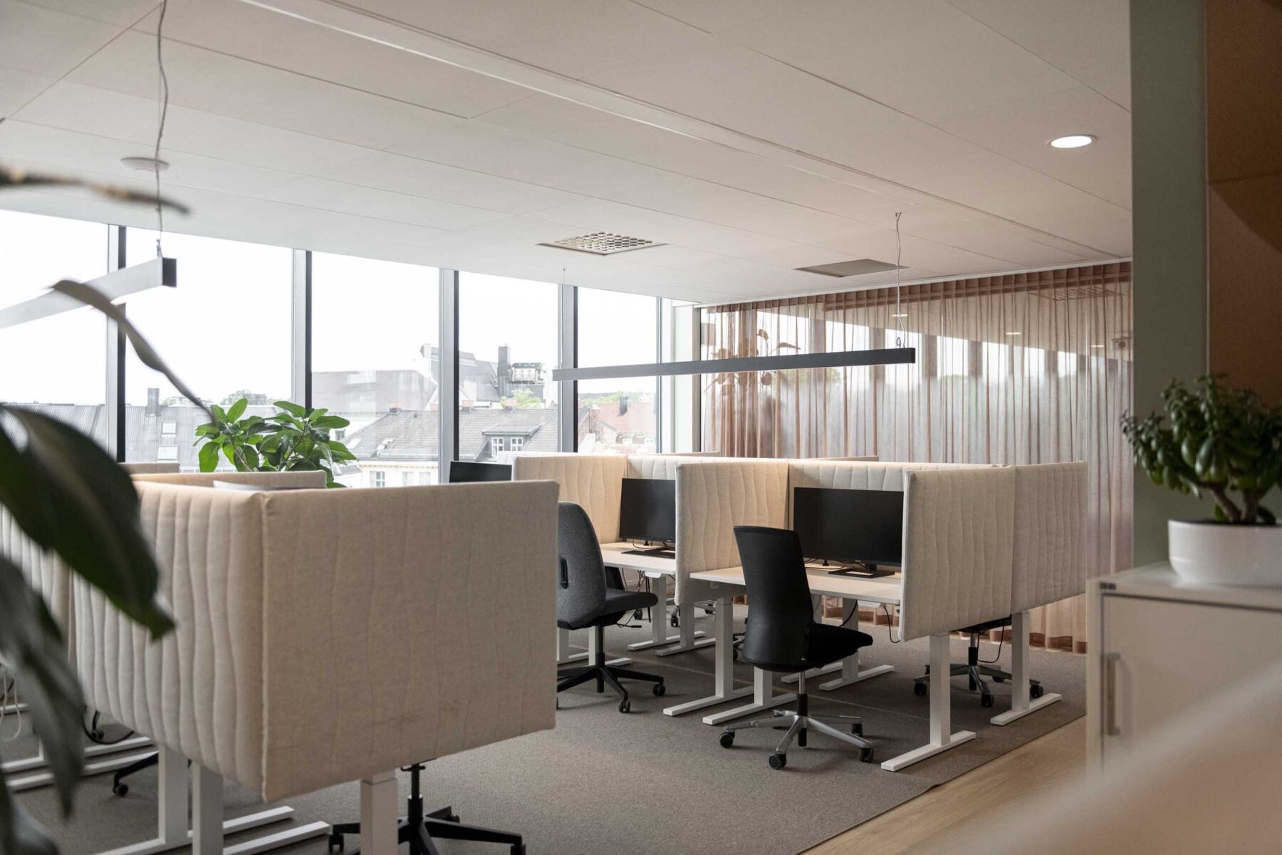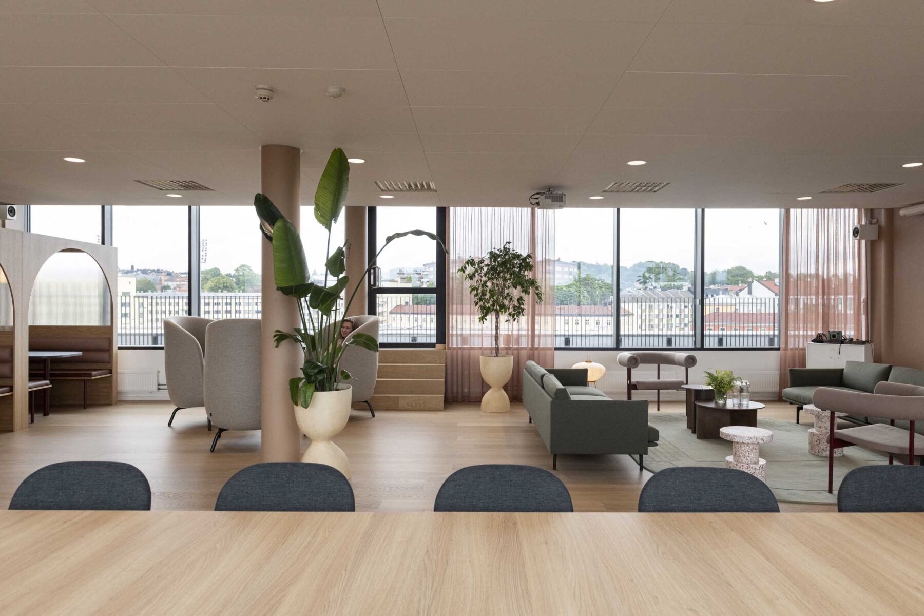Dette er et gjenbruksprosjekt hvor parketten ble slipt og lyslasert, glassvegger ble flyttet og gjenbrukt, og kjøkkenfrontene ble lakkert. Arbeidsbord, møtebord – og stoler er gjenbrukt som de var, mens vi har supplert med møbler med nye funksjoner, samt tekstiler og akustiske paneler for å skape et bedre lydmiljø.